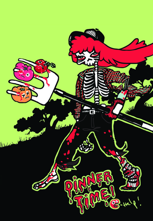 Dans les films de Romero, les zombies continuent de faire le travail de leurs vies antérieur. Ici, nous avons la preuve! Notre fermière zombie ne peut pas s’empêcher d’empaler ses variétés préférées de tomate.
